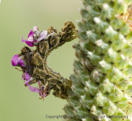 This one (above) was on a black-eyed susan flower in one of my backyard prairie gardens. The only reason I saw it was that it was walking across one of the flower petals. It looked like a bit of mung, but I stopped to look more closely and figured out what it was. It’s only the second time I’ve seen one – the last one was on purple prairie clover, and the photos I took of that one (below) showed up in a lot of places, including NEBRASKAland magazine.