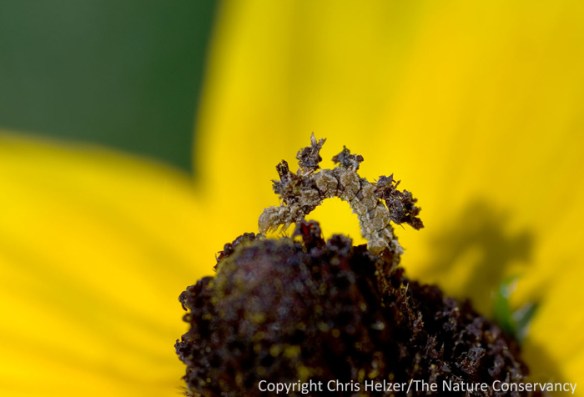 A camouflaged looper caterpillar on a black-eyed susan flower. The inchworm has camouflaged itself by attaching pieces of the flower to itself.