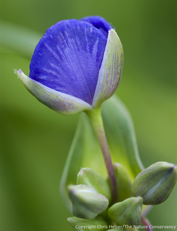 The species shown here is Ohio Spiderwort (aka “bluejacket”), which can be found throughout most of eastern North America.  I find spiderworts to be particularly photogenic flowers, and consequently have a lot more photos of them than I probably need.  However, this shot is a little different from the rest because the flower is just starting to open, and it shows the underside of the petals as they’re unfolding from the bud.