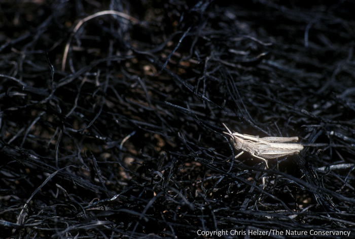 This poor light-colored grasshopper nymph was nicely camouflaged against the dormant grass in this prairie until a prescribed fire drastically changed its surroundings.  This nymph was fortunate to survive the fire, but will now have a bit more trouble hiding from predators!