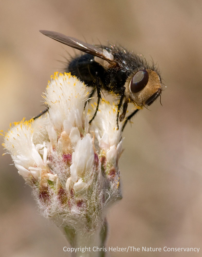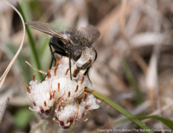 Regardless, the pussytoes had the wildflower blooming stage to themselves on this early April day.  I needed to scratch my itch for wildflower photography after a long winter, so I laid down with my tripod and focused in on a few plants.  As often happens when I take the time to sit down in a prairie, I noticed other things around me.  This time it was the buzzing of pollinators who had also noticed that pusseytoes were blooming.  As I watched, I counted at least 8 species of pollinating insects bouncing from flower to flower, looking for those with pollen-laden anthers.  Most of the insects were flies, but a few bees and a moth were among the visitors as well.  Elsewhere on the prairie I saw some orange sulphur butterflies too, but never actually saw one land on a pussytoes flower.