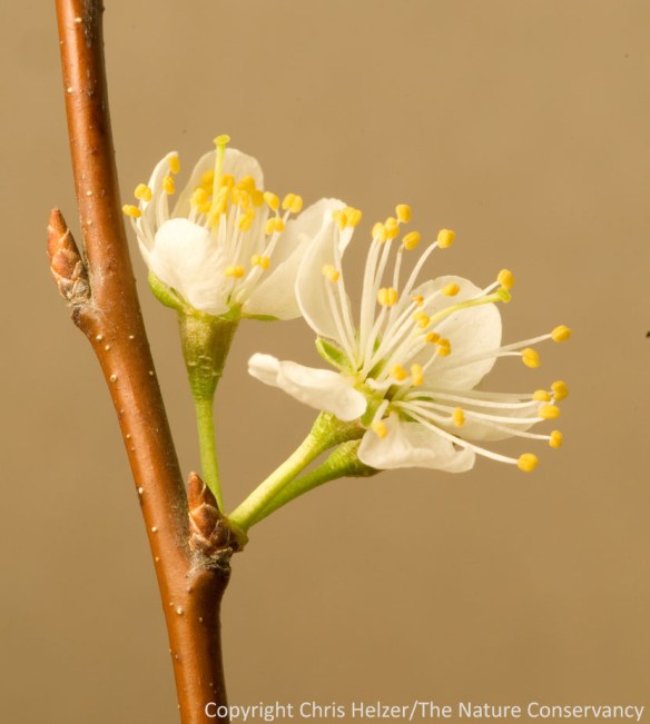 Blossoms and buds of a wild plum. The flower buds have already opened, but the leaf buds are still tightly closed.