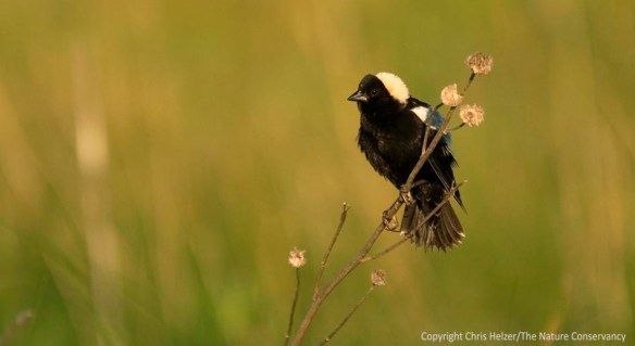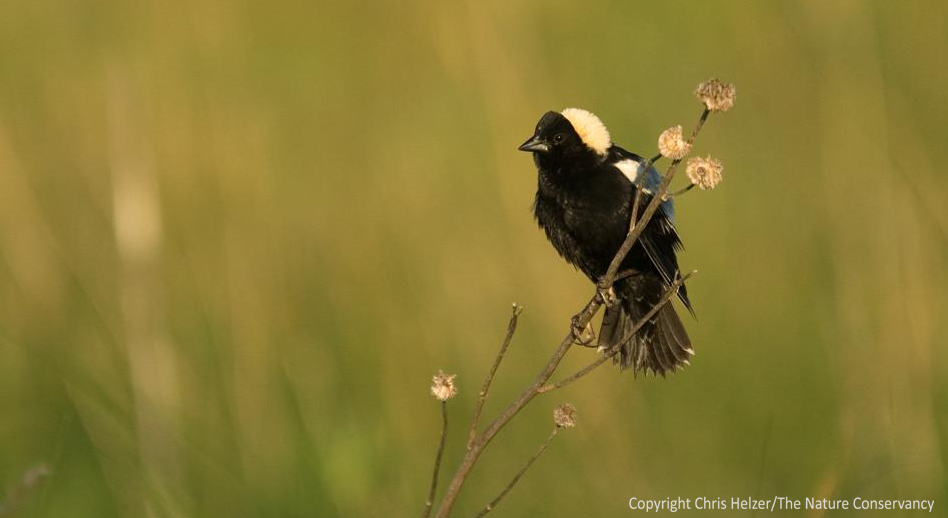 Bobolinks are frequently found in hayed prairies along the central Platte River, as well as in light-moderately grazed prairies. (This one is sitting in a restored prairie)