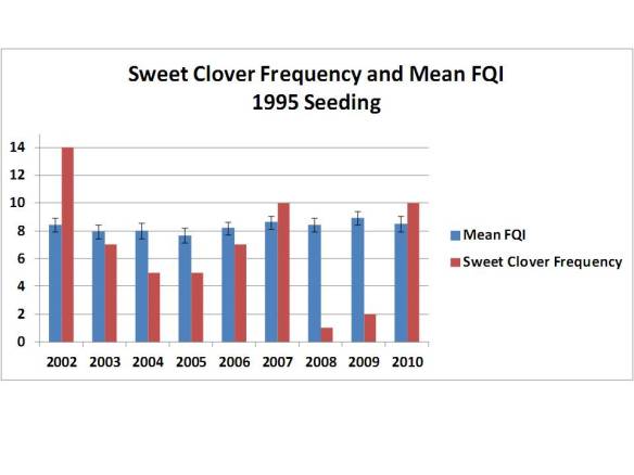 • Stephanie – I’m not sure how we could answer that question… It’d be nice to know! I could reanalyze the data and pull out the sweet clover to make it look like it’s not there, but that obviously wouldn’t give us what we want to know, because nothing would be growing in that space. My guess is that sweet clover in my sites is just another species, and that removing it wouldn’t change the FQI or the plant community in any significant way. But it’s just a guess.
