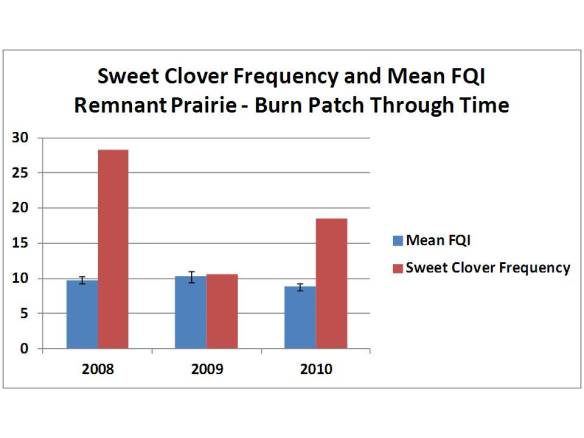 The FQI values at your sites seem low to me. This indicates the areas you are working at must be degraded or are restorations. It has been my observation that Sweet Clover is more of a problem in restorations than undisturbed high quality sites. I wonder how your sites would compare to those with higher FQI values.