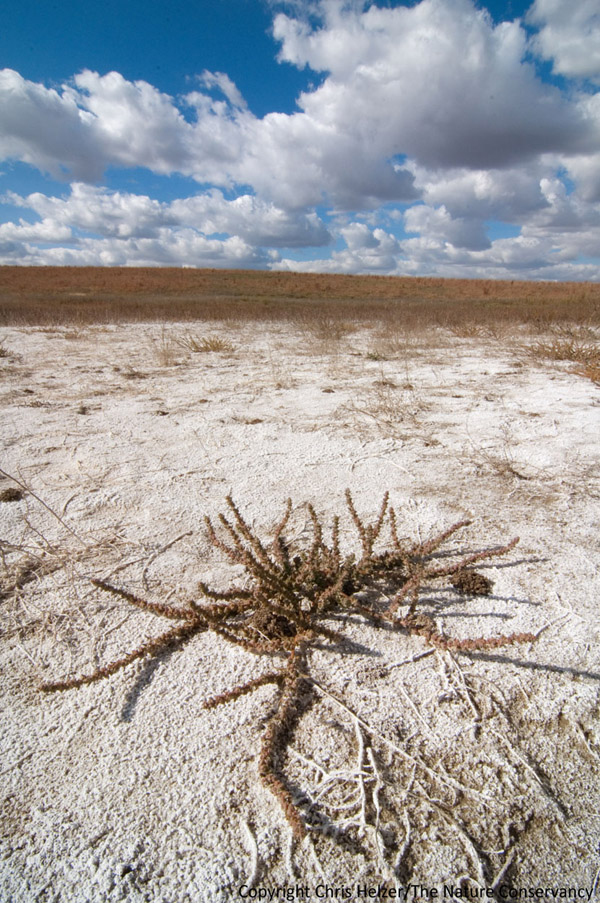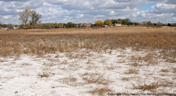 What looks like sand is really a crust of salt that formed across a “salt flat” at the Conservancy’s Little Salt Fork Marsh Preserve. When the wet soil dries, the concentration of the salts becomes obvious. The houses in the background are an increasingly familiar site along the boundary of the remaining salt marshes. The current and future impacts of the houses, roads, wells, and other associated developments on the hydrology of the saline wetlands are not well understood.