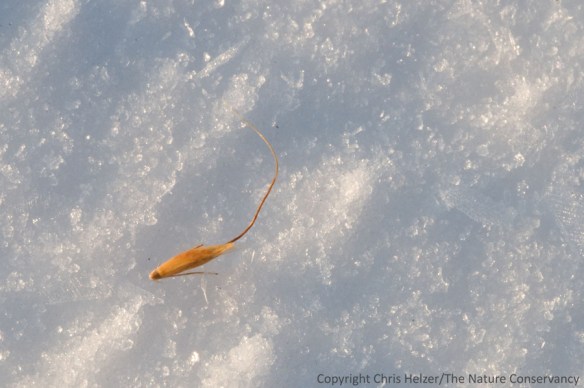 Wind and birds had knocked grass seeds, including this indiangrass seed, from the stems. This early in the winter, seeds are still abundant and tracks of birds and small mammals showed that many of them were being harvested from the snow.