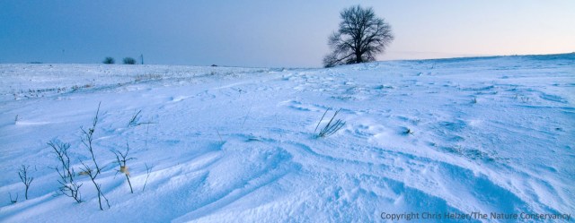 First snow of the season at the Helzer Prairie south of Aurora, Nebraska. This photo was taken well after the sun had gone below the horizon, resulting in a bluish tinge to the snow.