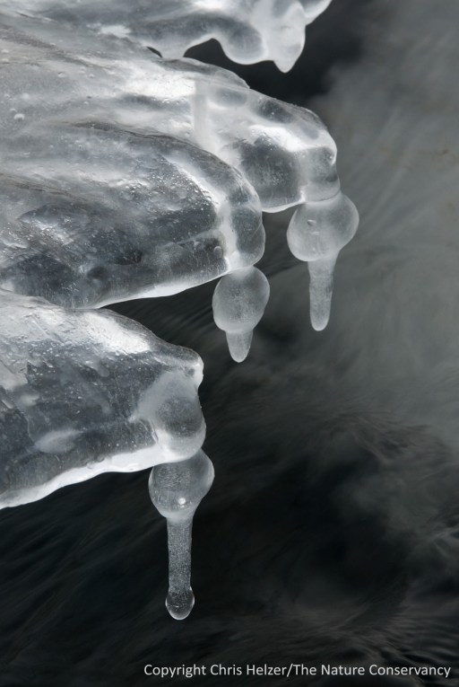 It was a bright overcast day with high thin clouds that eliminated shadows but still created a well-lit scene. Cameras can only handle a certain range of light from bright to dark, so the degree of contrast between the white ice and the darker water below is what results in the black and white look of this image. I wanted to be sure I captured the details in the bright white ice, but in doing that, the camera was unable to also capture the full range of colors and tones in the much darker water below. As a result, the water shows up in the photo as black. In a delightful bit of serendipity, the glare from the bright sky reflecting on the dark water created some terrific highlights that both break up the dark background behind the ice and show the movement of the water beneath.