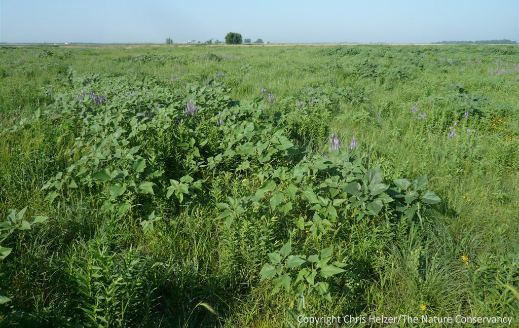 Last year, annual sunflowers (the big-leaved plants) were abundant across the burned/grazed portion of this 2002 prairie restoration. In the several-acre-sized exclosure that was also burned, the sunflowers were quite a bit less abundant – and appeared to be small in size.