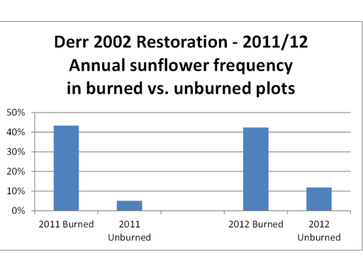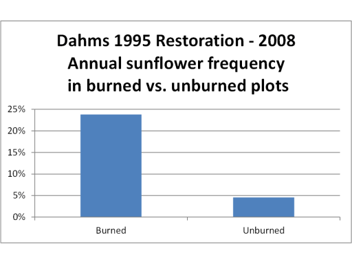 To be sure I was seeing what I thought I was seeing, I went back to my data from previous years, and sure enough – annual sunflowers were always much most abundant in areas of prairie burned in the spring of the year I was collecting data. It wasn’t the grazing that controlled sunflower establishment – it was the burning.