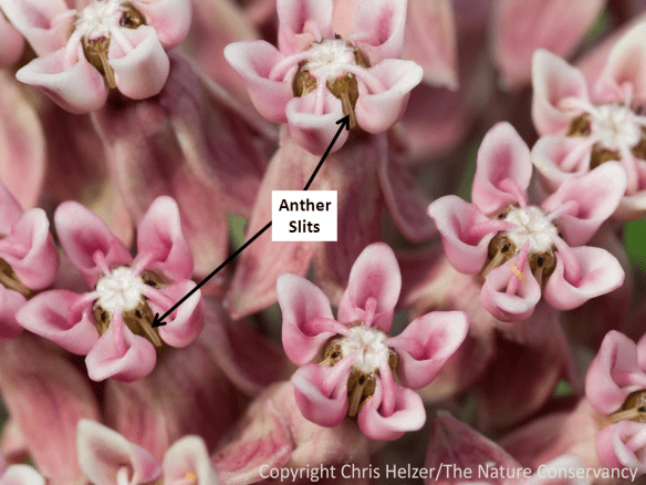 Here is a slightly zoomed in look at the milkweed flowers, with arrows indicating the tiny slits between anthers, into which an insect’s leg must slip in order to pick up the waxy bundle of pollen.