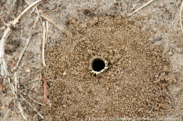 Chris, according to Jack Neff’s work on the nesting biology of the Callirhoe bee (Diadasia afflicta, in the Journal of the Kansas Ent. Soc 1982, Vol 55, p. 499)., the pollen grains around the rim (turret) of the nest opening (visible in your photo above) are probably fecal pellets (digested pollen grains) from the adult female – a curious thing, I can’t think of any other bees that do this…