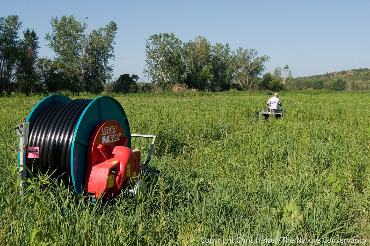 3. Irrigation.  Rainfall may or may not come at the right times or amounts to stimulate seed germination in disked sites or to ensure survival of our tree plantings.  Irrigation will allow us to narrow down the causes for good or poor tree establishment by controlling the amount of moisture available for young trees – at least in small areas.  In addition, if irrigation turns out to make a really big difference in survival and establishment, there are significant areas of land along the Missouri River that have center pivot irrigation systems in place, and if those areas are converted to natural habitats in the future, those irrigation systems could be put to use.
