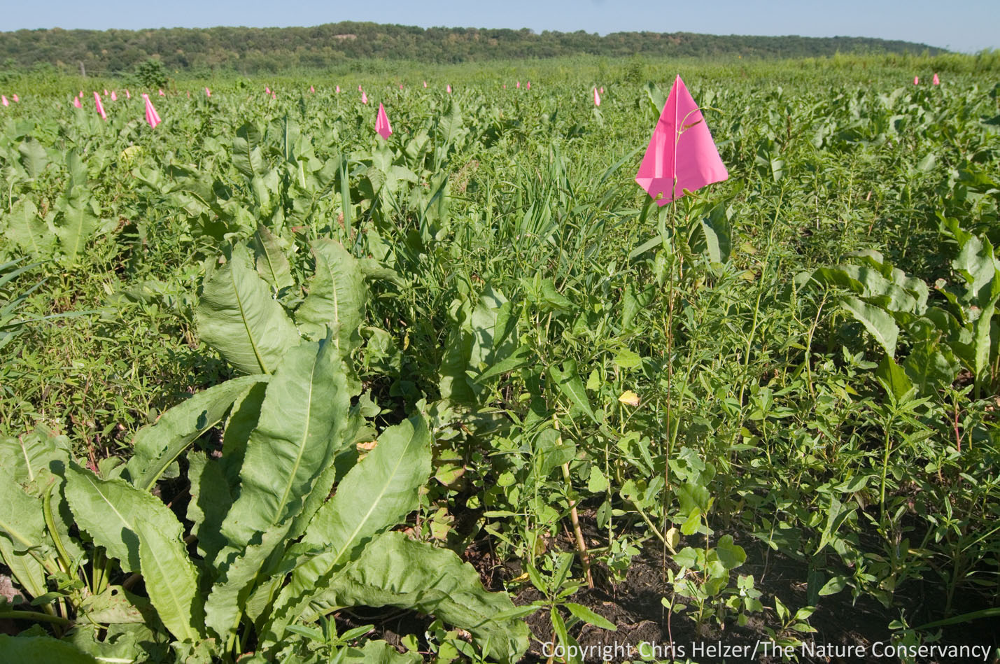 Flags mark some of the seedlings that established on their own in a disked area under irrigation.
