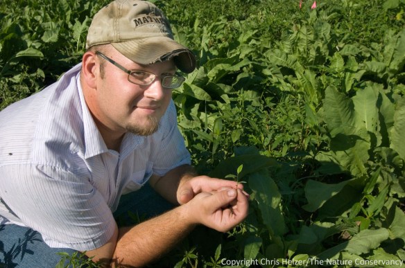 Tyler Janke, our Missouri River restoration ecologist, holds a young cottonwood seedling from our demonstration project’s first season.