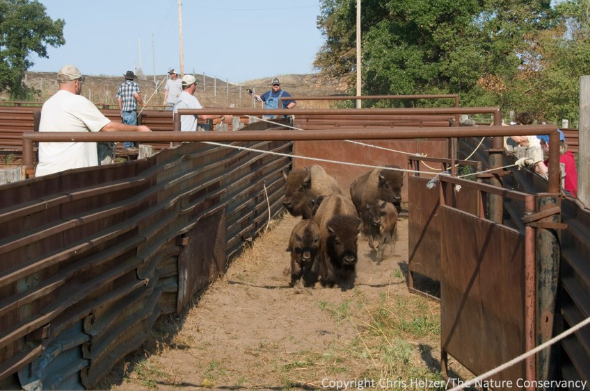 G Published August 14, 2012 at 1429 × 949 in Bison Roundup 2012 Bison coming down the lane, gate closers at the ready. Niobrara Valley Preserve