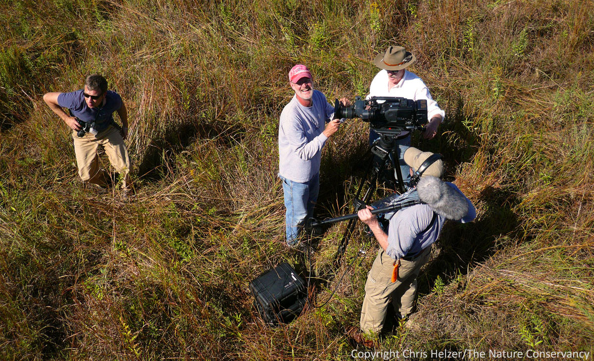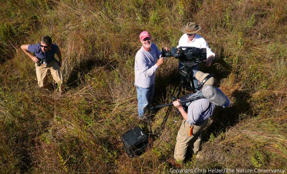 A film crew in our seed shop, with TNC employees Nelson Winkel (cowboy hat) and Nanette Whitten (background).