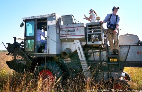 Bill Whitney drives the Prairie Plains Resource Institute combine through our prairie with a camera man in the cab and a sound man hanging on to the back.
