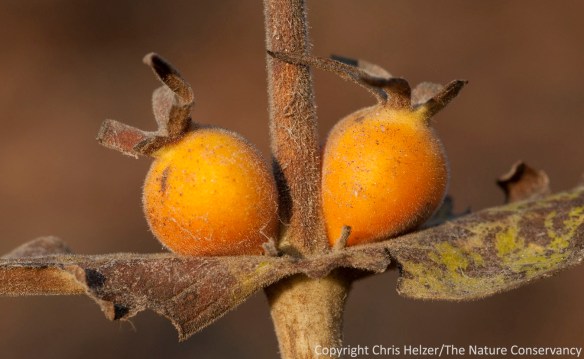 Also known as wild coffee because its fruits can be used as a substitute for coffee, late horse gentian’s orange fruits stand out in autumn woodlands. I found a small group of these plants on the edge between prairie and woodland at our Rulo Bluffs Preserve a couple weeks ago. They were pretty hard to miss – I saw them from about 20 yards away as I came up out of a deep wooded draw. I was hoping to get some photos of the prairies before the sun went behind the nearby bluffs, but I couldn’t resist pausing a few moments to photograph this unique plant.