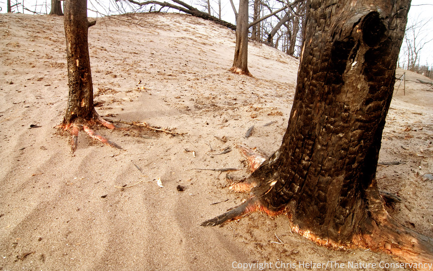 The Nature Conservancy’s Niobrara Valley Preserve about four months after the 2012 wildfire. Rippled sand on the north side of the river, under burned oaks and eastern redcedar trees.