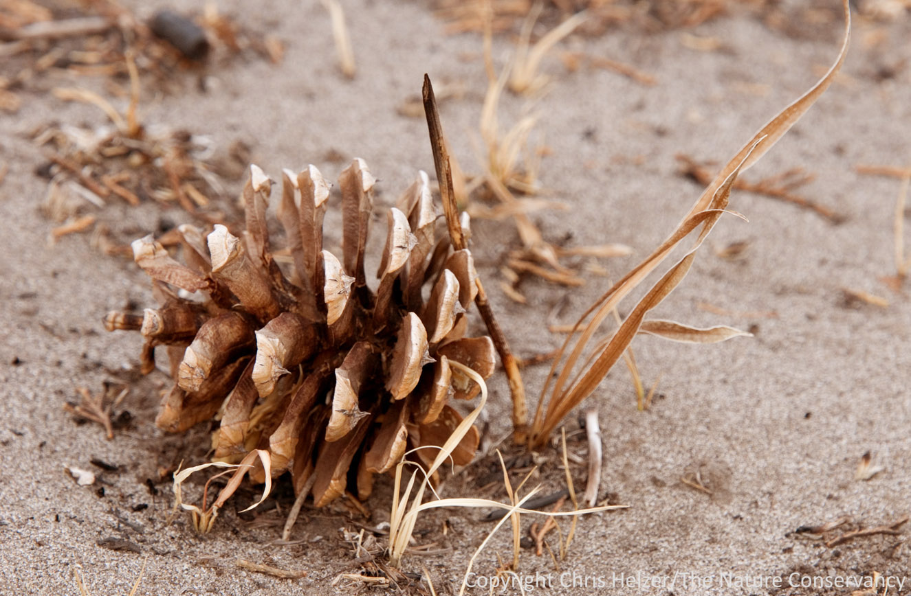 The Nature Conservancy’s Niobrara Valley Preserve about four months after the 2012 wildfire. Pine cone on the ground.