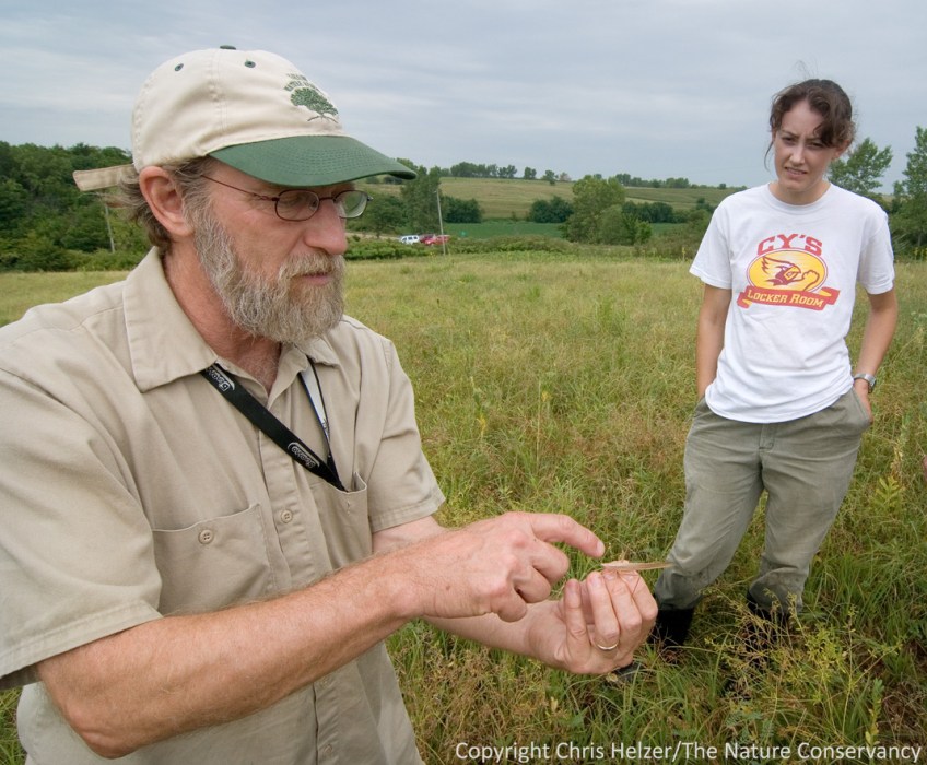 ENPO120709_D003 Published December 13, 2012 at 1069 × 883 in Best of Prairie Ecologist Photos – 2012 James Trager, naturalist at the Shaw Nature Reserve, displays the finer points of a katydid in southeastern Nebraska. James Trager holding a katydid. Eichenberger North hay meadow – Pawnee County, Nebraska.