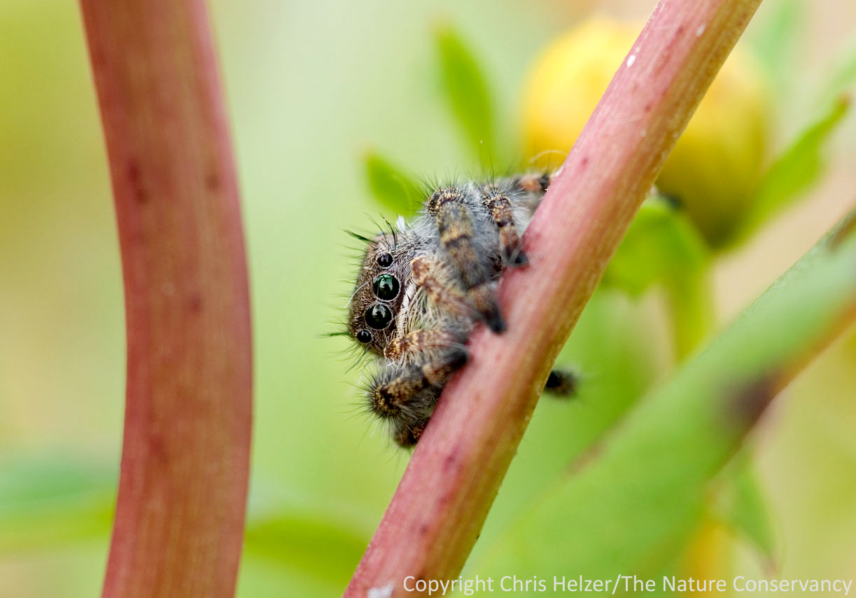 ENPO120920_D014 Published December 13, 2012 at 1223 × 854 in Best of Prairie Ecologist Photos – 2012 A jumping spider on a beggarstick plant in a restored wetland. Jumping spider at the Derr Sandpit Restoration. The Nature Conservancy’s Platte River Prairies, Nebraska