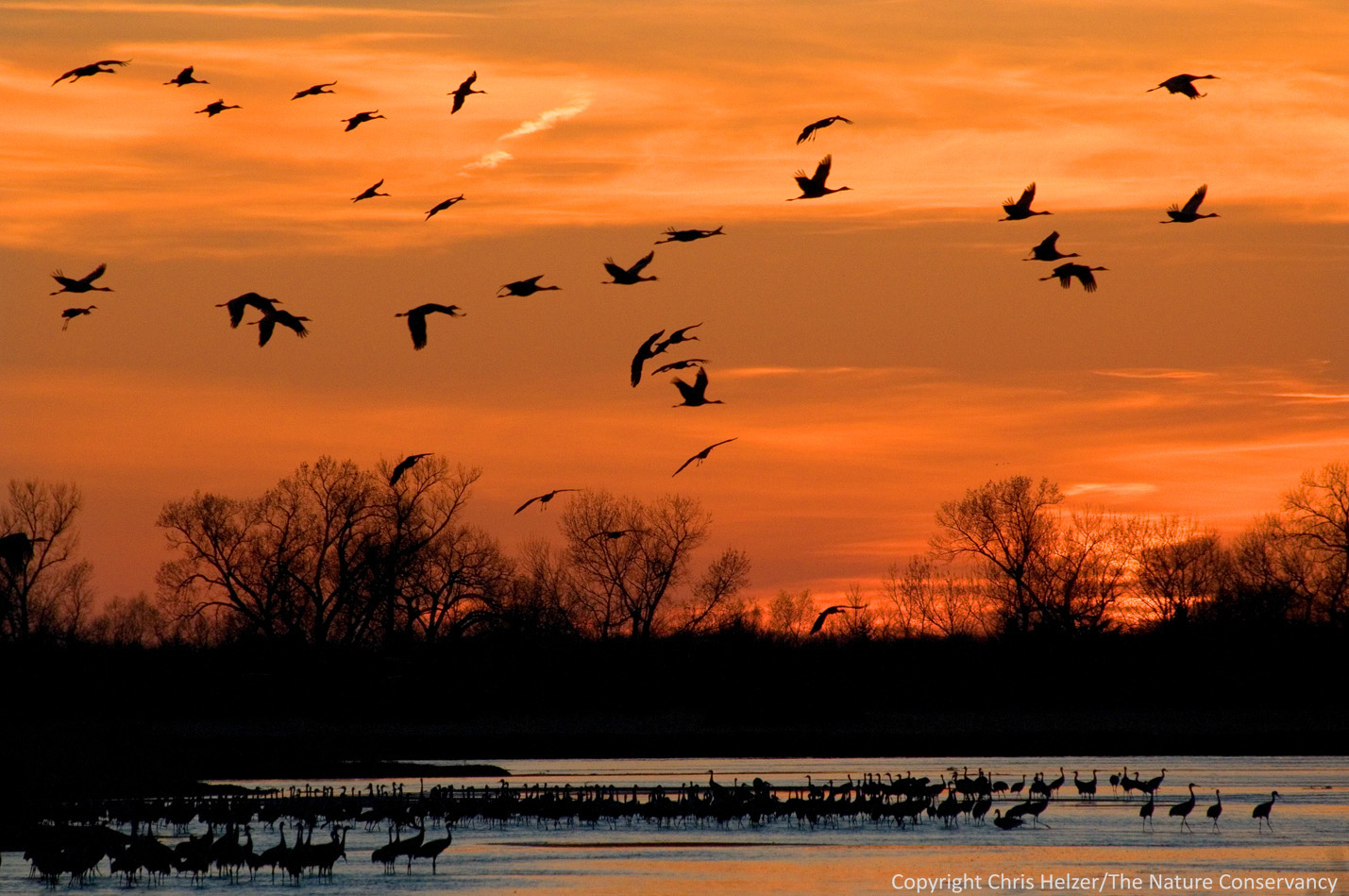 Sandhill cranes on the Platte River. Nebraska. TNC Studnicka Tract Published December 13, 2012 at 1429 × 949 in Best of Prairie Ecologist Photos – 2012 Cranes coming into the roost at sunset.