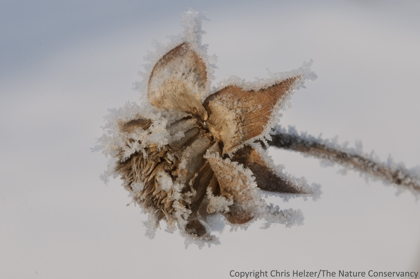 A frosty rosinweed seed head in winter prairie.  Aurora, Nebraska.