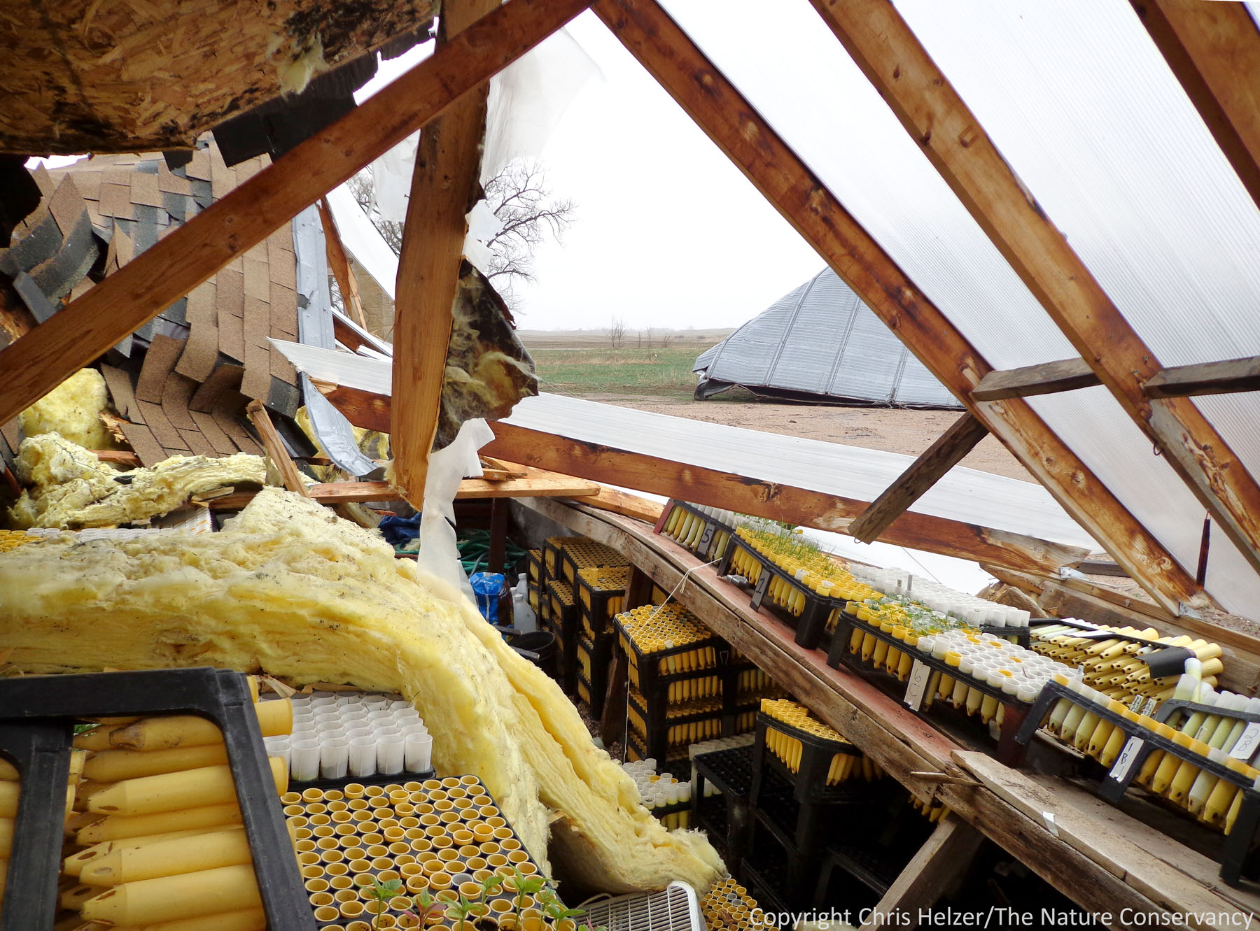 The good news: We were able to get most of the plants out of the greenhouse and into another building before the winter storm hit this afternoon. We’ve got tarps on the crew quarters roof, so it should be watertight for the near term. Most impressively, the crew from Southern Public Power District was on site within a half hour after I called them and were busily replacing broken power poles and lines. (THANKS GUYS!)