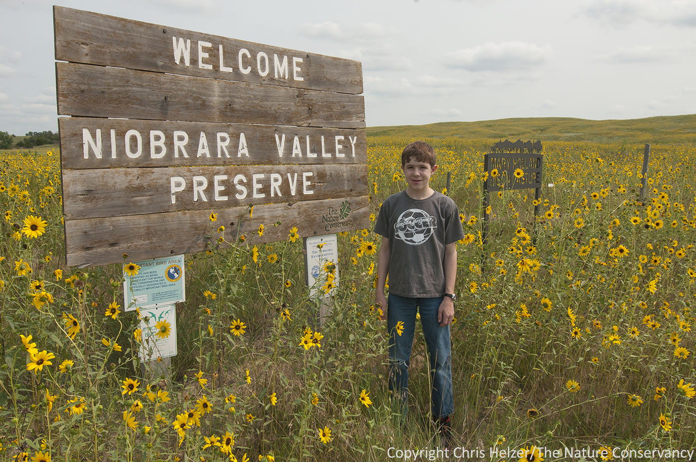 My son John, standing at the welcome sign for the Preserve. Did I mention there were some sunflowers blooming in the sandhills this year?