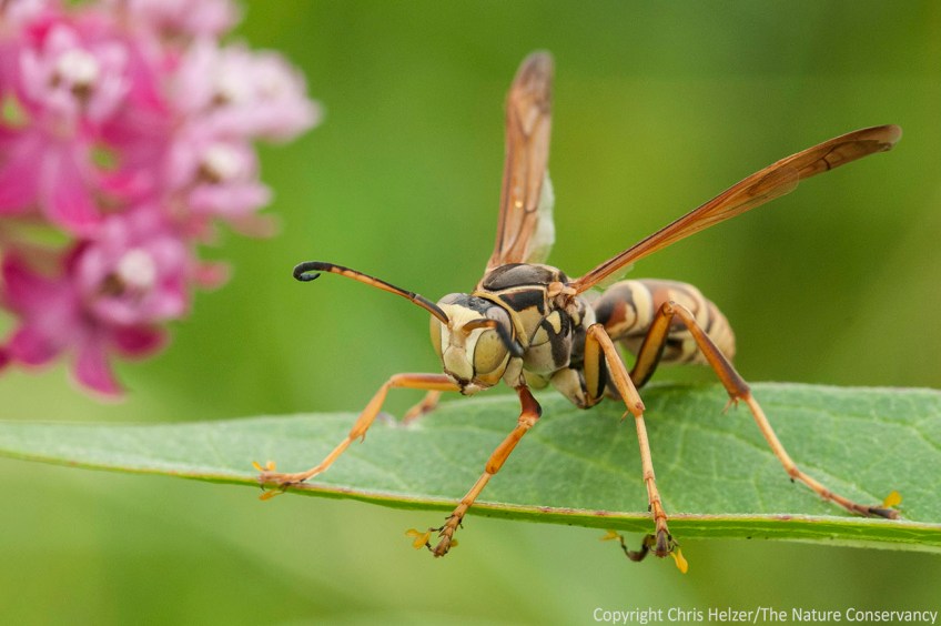 ENPO130730_D022 Published August 17, 2013 at 1293 × 860 in The Softer Side of Wasps The same wasp a few minutes later, with multiple pollinia attached to its feet. Paper wasp (Polistes fuscatus) male on swamp milkweed. Derr Sandpit Wetland Restoration. Platte River Prairies, Nebraska.
