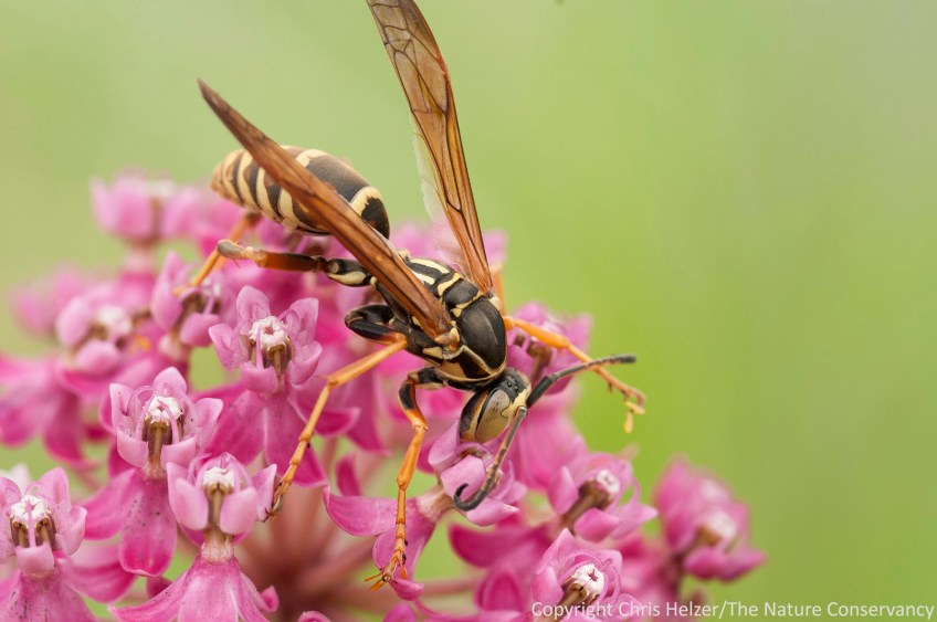 ENPO130730_D030 Published August 17, 2013 at 1608 × 1068 in The Softer Side of Wasps A paper wasp (Polistes fuscatus) feeding on milkweed nectar. Paper wasp (Polistes fuscatus) male on swamp milkweed. Derr Sandpit Wetland Restoration. Platte River Prairies, Nebraska.