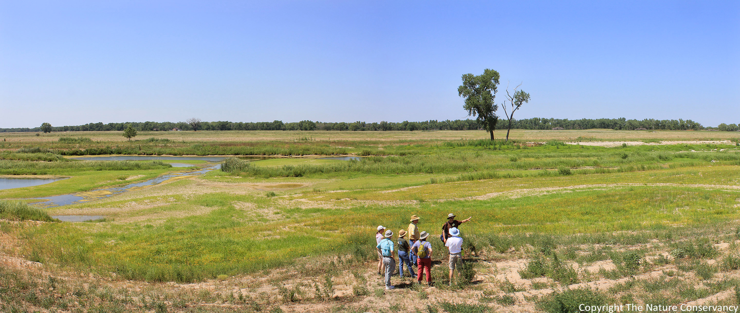 A prairie ecologist talks to a tour group about the restored wetland site during the drought of 2012.