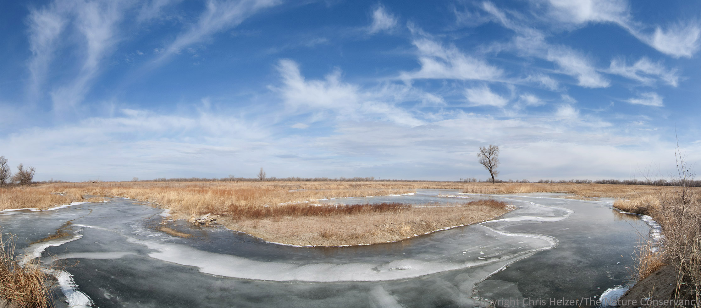 A panoramic photo made up of nine different images stitched together. The Nature Conservancy’s Derr Wetland Restoration, Nebraska. Click on the photo to see a larger version of it that better portrays the feel of the site.