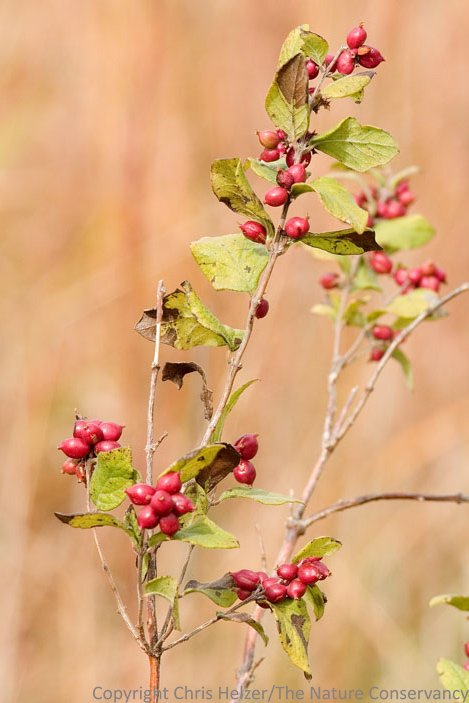 Many thanks to everyone who guessed at the identity of the plant species featured in yesterday’s post.  Here is another photo of the same plant species in bloom, from a little further away.  The species is commonly named “buckbrush”, which actually refers to a couple different species in the genus Symphoricarpos.  I believe this particular one is wolfberry, aka western snowberry (Symphoricarpos occidentalis), though it can be difficult to tell without seeing the fruits.  Wolfberry has white or light-colored fruits, while its cousin coralberry has red fruits.  Both grow together in many of our Nebraska prairies.  I’ve included a photo of coralberry fruits below – I don’t have a good photo of wolfberry with white berries.