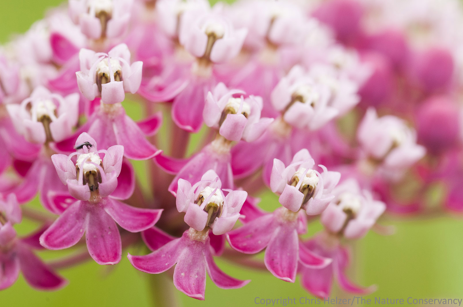 Swamp milkweed, displaying the distinctive flowers of milkweed. Notice the conspicuous absence of visible anthers (the little appendages that hold pollen).