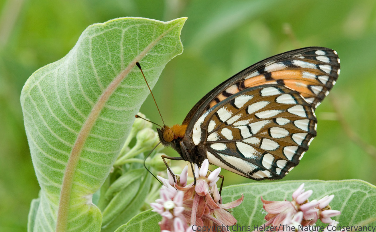 Regal fritillary butterfly on milkweed at Helzer prairie, south of Aurora, Nebraska.