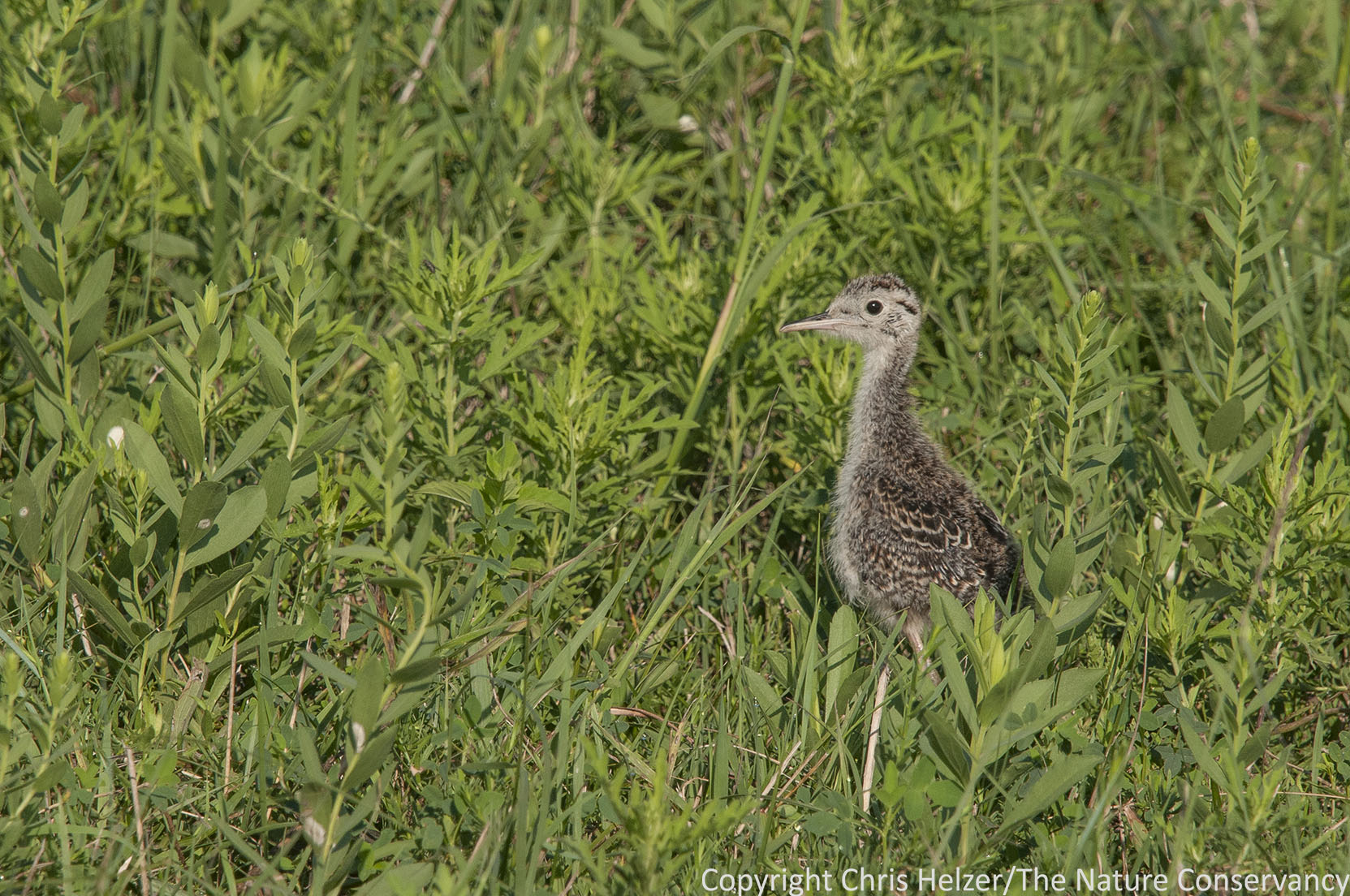 This young upland sandpiper and its parents were enjoying a part of the prairie where cattle had been grazing most of the season, keeping grasses short but allowing some forbs to grow tall.  The chick could feed in the open but remain close to protective cover.