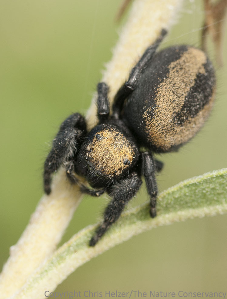 Big jumping spider (Phiddipus apacheanus) on Maximilian sunflower. TNC Platte River Prairies, Nebraska.