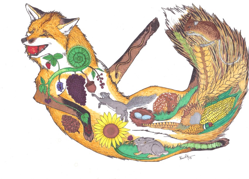 chubfox Published December 18, 2015 at 6859 × 4947 in Hubbard Fellowship Blog – What Does the Fox Eat? A drawing inspired by the indiscriminate dietary habits of foxes. Everything inside of the fox itself are things that they will eat if they can get them. Marker drawing by Kim Tri.