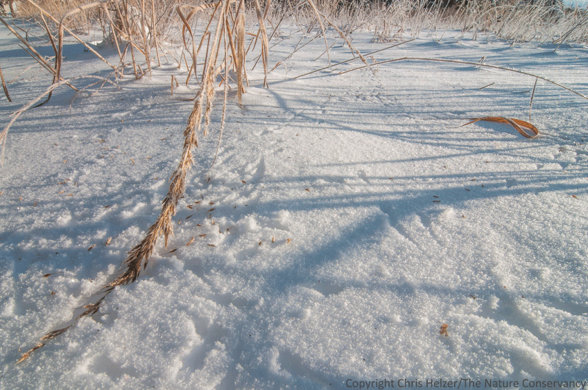 ENPO160204_D001 Published February 8, 2016 at 1429 × 949 in Prairie Blizzard Survival Songbird tracks around an indiangrass seed head at Lincoln Creek Prairie in Aurora, Nebraska.
