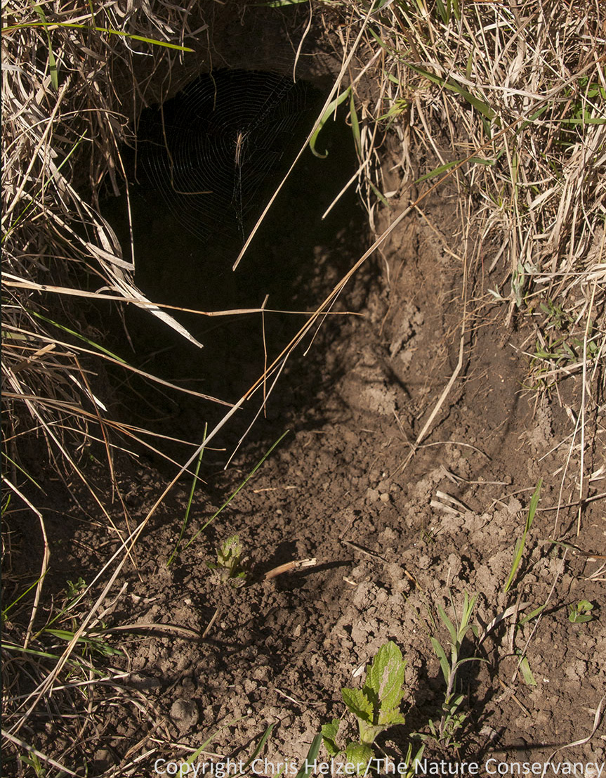 ENPO160422_D001 Published April 28, 2016 at 863 × 1107 in Photo of the Week – April 28, 2016 Spider and web at the entrance of a badger hunting tunnel (where a badger had dug a tunnel to catch a ground squirrel or some other small creature. Helzer family prairie. nebraska.
