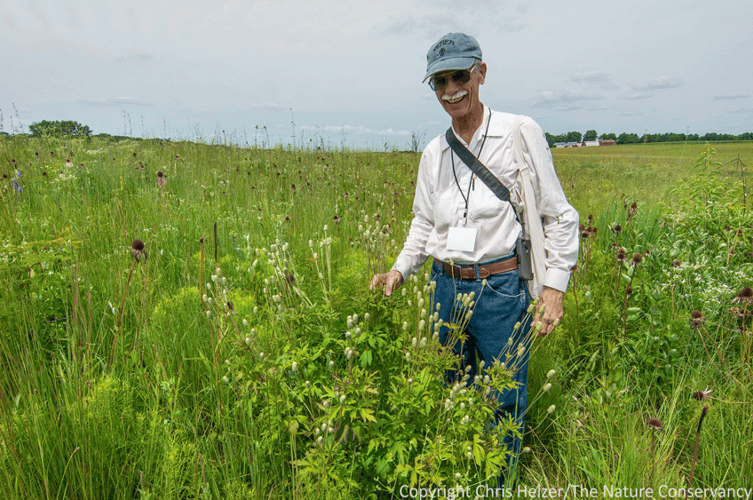 ENPO160719_D017 Published July 24, 2016 at 1600 × 1063 in Returning to Nachusa Grasslands Carl Kurtz, a well-known prairie restoration guru in Iowa stands next to a thimbleweed plant we were admiring. Neither of us had ever seen the plant grow so large.