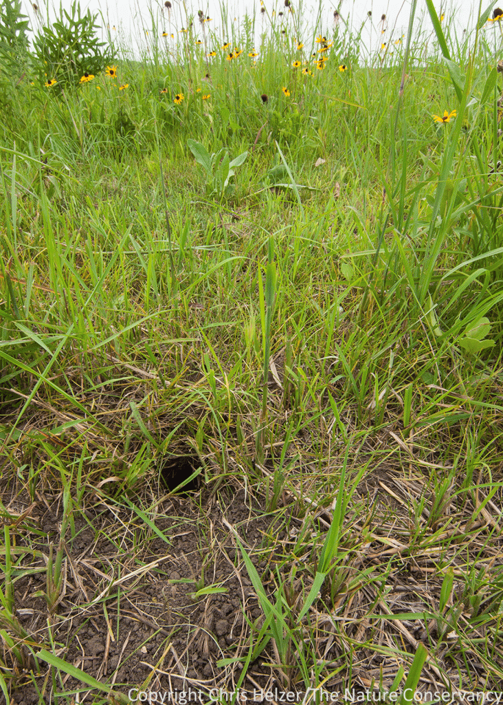 ENPO160719_D029 Published July 24, 2016 at 1143 × 1600 in Returning to Nachusa Grasslands This thirteen-lined ground squirrel burrow was evidence of habitat changes favoring animals that like short vegetation. Researchers will be looking for more of that among bird, mammal, insect and other communities.