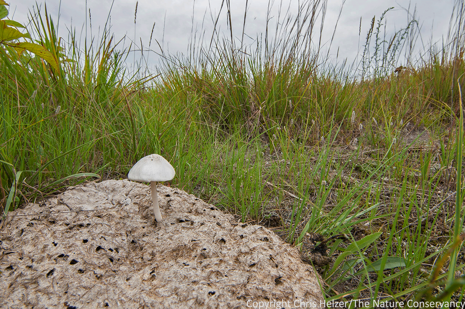 ENPO160719_D037 Published July 24, 2016 at 1600 × 1063 in Returning to Nachusa Grasslands Some bison impacts are unrelated to cropped vegetation, including bare ground created by wallowing, and the concentration and redistribution of nutrients through manure – something capitalized on by this mushroom.