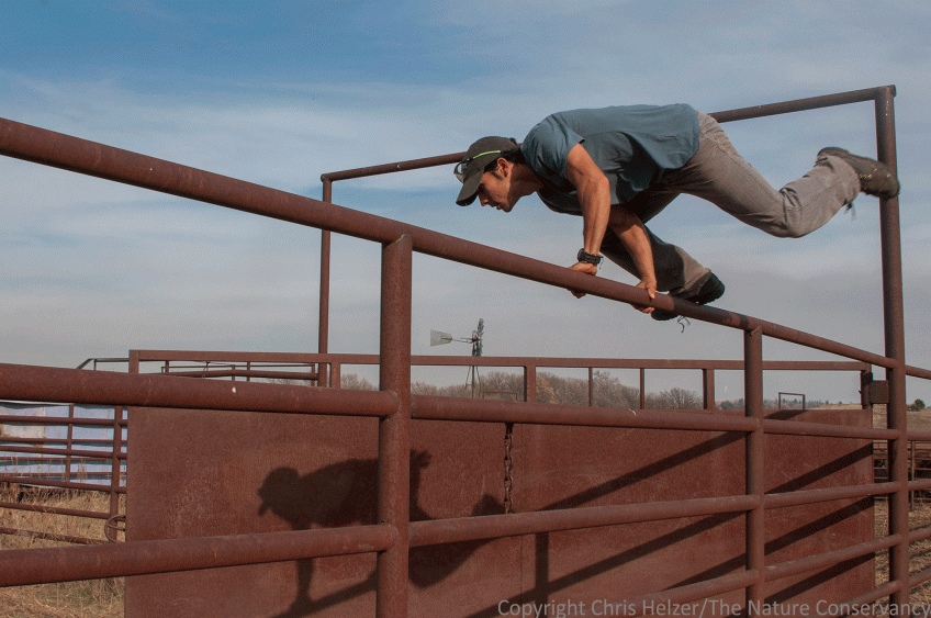 enpo161027_d042 Published October 31, 2016 at 1614 × 1072 in A Family Roundup Then he gets to show off his athleticism as he hurdles the fence and closes the gate behind the bison.