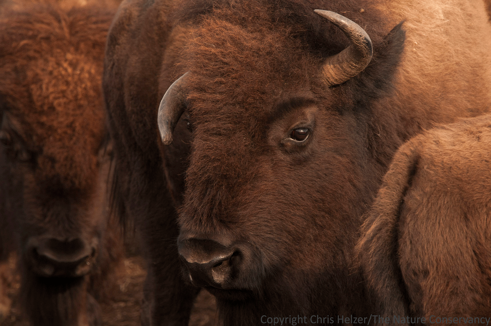 enpo161027_d052 Published October 31, 2016 at 1715 × 1139 in A Family Roundup Most of the bison were difficult to distinguish from each other, but a few had unique characteristics, including one with a particularly long mop of hair and this one with its kerwhacky horns.