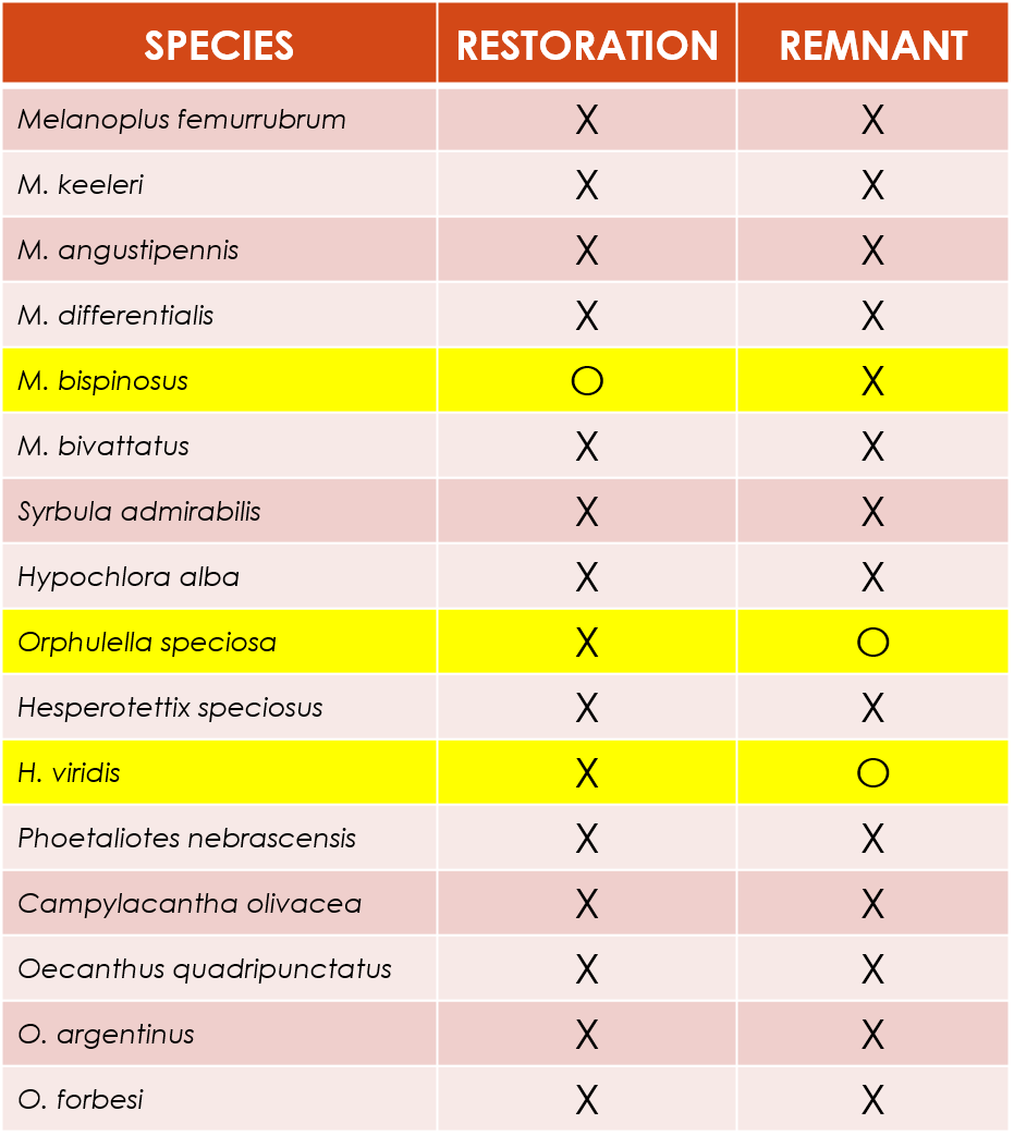Dillon Blankenship, a Hubbard Fellow, compared grasshopper, katydid, and tree cricket communities on three pairs of remnant/restored prairies back in 2014. Almost all species were present in both restored and remnant habitats. In the three species that weren’t, only one or a very few individuals were found, so it’s likely just a sample size issue.